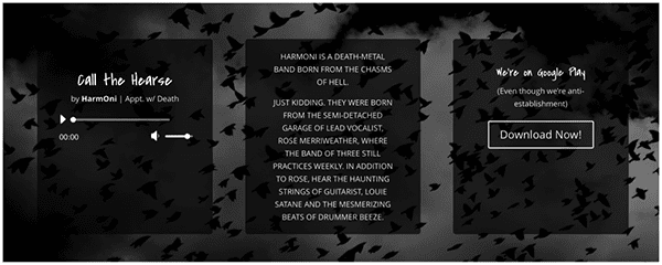 Hoy, vamos a diseñar una sección de audio «Heavy Metal» de tres columnas que incluye espacio para un reproductor de audio, una breve biografía y un botón de llamado a la acción, en caso de que desee dirigir a los visitantes a i-Tunes o Google Play para descargar tus últimos éxitos.