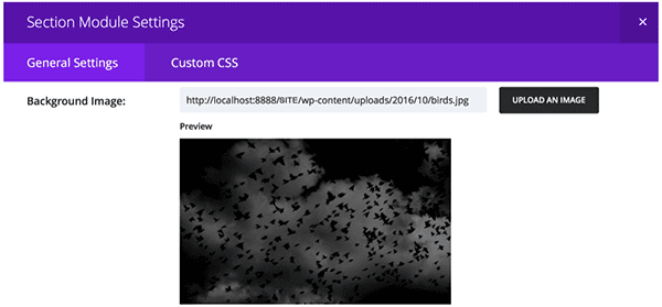 La configuración de la sección es sencilla e implica solo la carga de una imagen de fondo. (Puedes encontrar la foto siniestra que usé aquí , pero también puedes buscar en un sitio gratuito de fotografías de archivo como Pexels o Unsplash para encontrar una que se adapte mejor a tu propia estética).