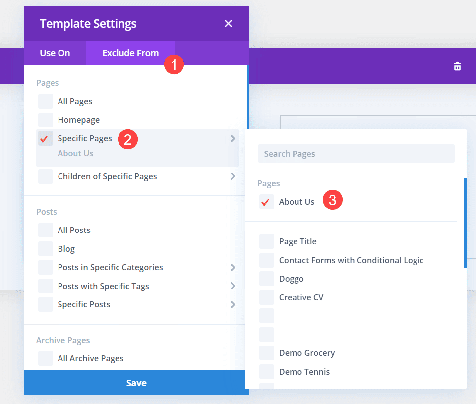 Ahora, supongamos que desea que su página Acerca de sea diferente. Esa es la página que desea excluir de la plantilla. Abriría la configuración nuevamente y entraría en la pestaña Excluir de .