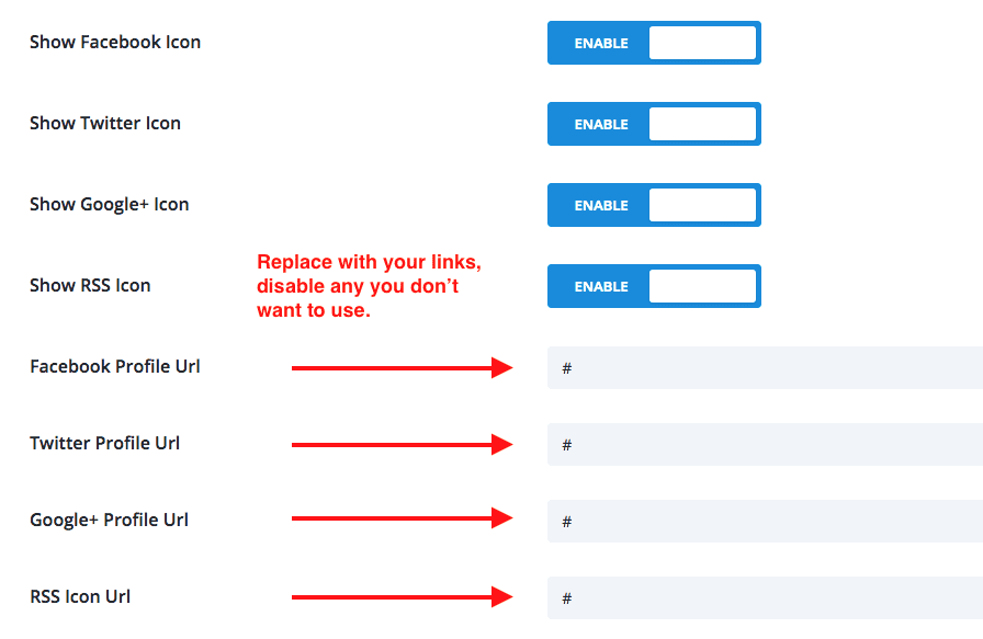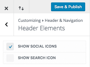 Vaya a Encabezado y navegación > Elementos del encabezado y marque la casilla Mostrar iconos sociales
