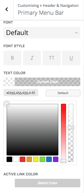 • Estoy usando rgba (255,255,255,0.6) como mi color de enlace y blanco sólido como mi color de enlace activo (simplemente me gusta el efecto visual que da)
