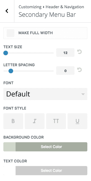A continuación, vaya a la configuración de la barra de menú secundaria y establezca los colores de fondo y de texto . Estoy eligiendo blanco como el color del texto porque voy a agregar un fondo de color redondo a cada ícono social para que coincida con mi nuevo color de menú, por lo que el ícono debe aparecer.