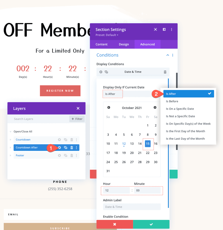 Abra la configuración de la sección duplicada y actualice la opción de condición de visualización Fecha y hora Mostrar solo si la fecha actual es posterior a . Asegúrese de mantener la fecha y la hora exactamente igual que el temporizador de cuenta regresiva. Queremos que esta sección se muestre después de que expire el temporizador de cuenta regresiva.