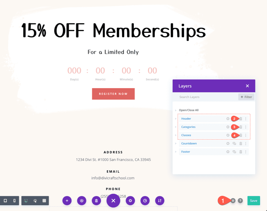 A continuación, mueva el temporizador de cuenta regresiva una posición hacia arriba, justo debajo del módulo de texto superior con el encabezado principal. Luego elimine el módulo de botones en la parte inferior. Reemplazaremos esto con un módulo de opción de correo electrónico.