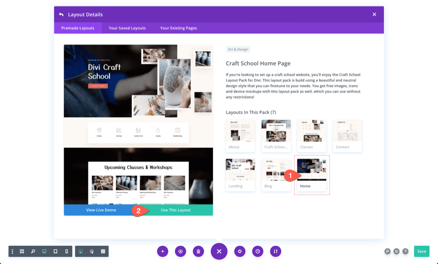 Abra el menú de configuración de la página y luego haga clic en el icono más para que aparezca la ventana emergente Cargar desde biblioteca. Encuentre el paquete de diseño de Craft School y luego haga clic para usar el diseño de la página de inicio de Craft School.