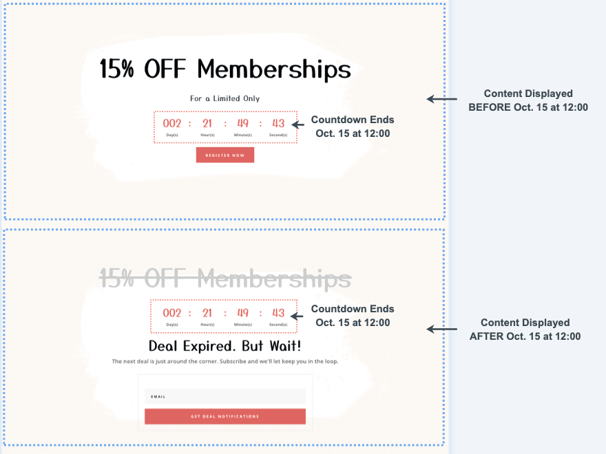 Mostrar contenido condicional de tiempo cuando expira un temporizador de cuenta regresiva puede ser una poderosa herramienta de marketing. Sabemos que esos temporizadores de cuenta regresiva son una de las mejores formas de incentivar a los usuarios a tomar medidas en un sitio web. Son perfectos para presentar ofertas por tiempo limitado para membresías, productos, promociones de Black Friday, etc. Pero cuando el tiempo llega a su fin, tienes una gran oportunidad para volver a dirigirte a los visitantes con contenido condicional de tiempo. El contenido condicional de tiempo es contenido que se muestra (u oculta) en una página web antes o después de una fecha y hora establecidas. Por lo tanto, tiene sentido tener contenido nuevo listo para mostrar a los visitantes que se perdieron una oferta o se quedaron sin tiempo.