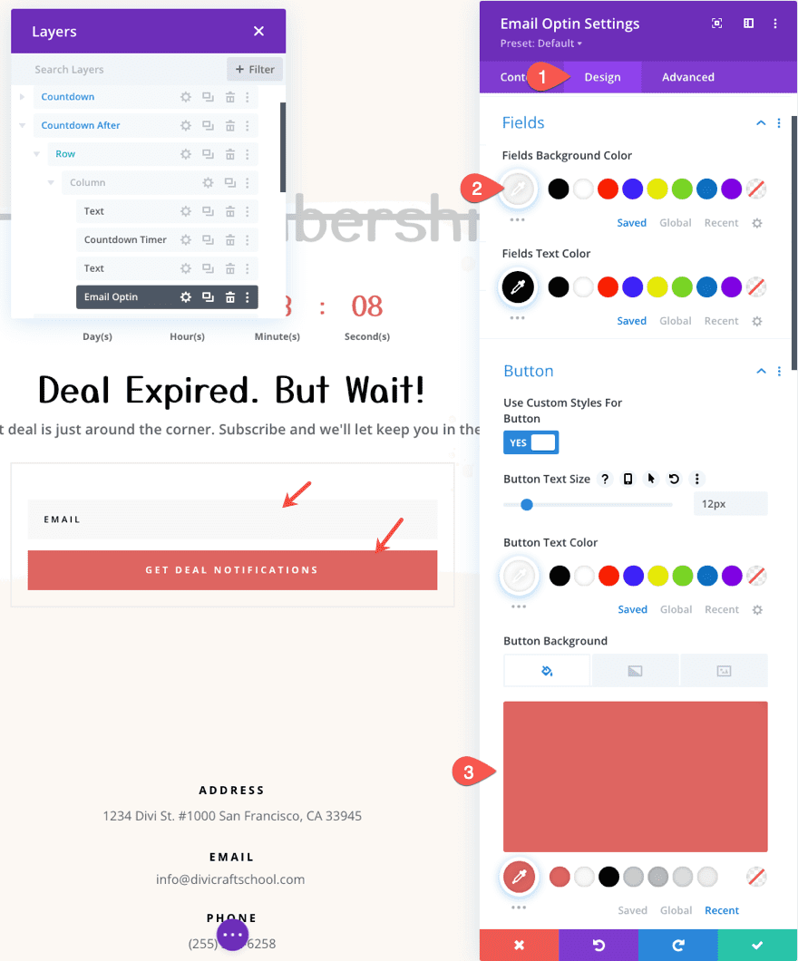 En la pestaña de diseño, actualice los colores del campo y del botón de la siguiente manera: