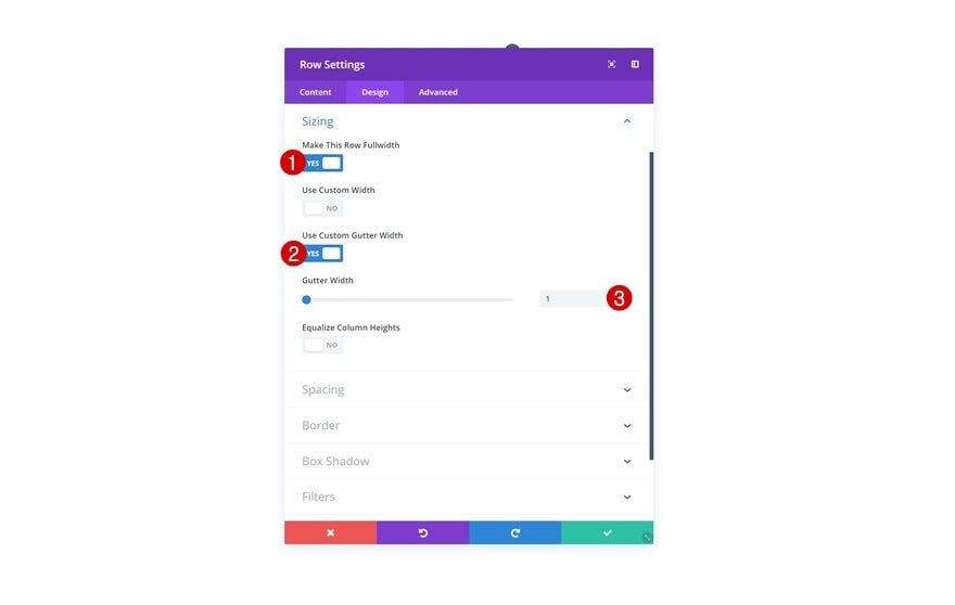 Sin agregar ningún módulo todavía, abra la configuración de fila y vaya a la configuración de tamaño. Aquí, vamos a eliminar todo el espacio entre la sección, la fila y la columna. En otras palabras, la columna ocupará todo el ancho de la pantalla.