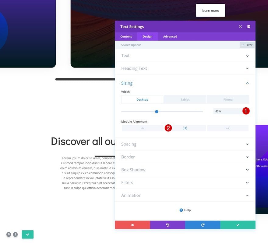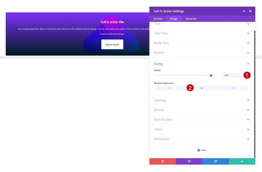 También es importante disminuir ligeramente el ancho del Módulo CTA en la configuración de tamaño. Esto asegurará que siempre haya un espacio entre este módulo y el siguiente módulo en el mecanismo de deslizar/desplazarse.