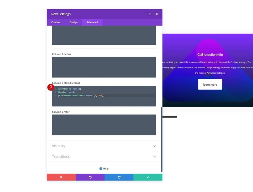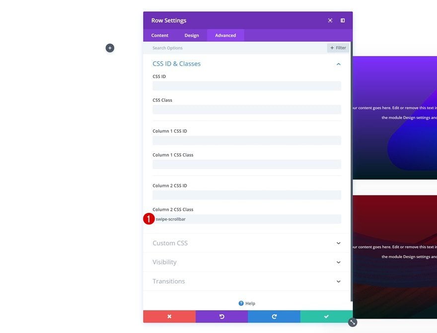 Como se mencionó anteriormente, estamos convirtiendo la columna misma en un mecanismo de cuadrícula de deslizamiento/desplazamiento. Para hacer eso, necesitaremos tres líneas de código CSS personalizado, que puede encontrar a continuación. Continúe y agréguelos al elemento principal de la columna en la pestaña avanzada de la fila.