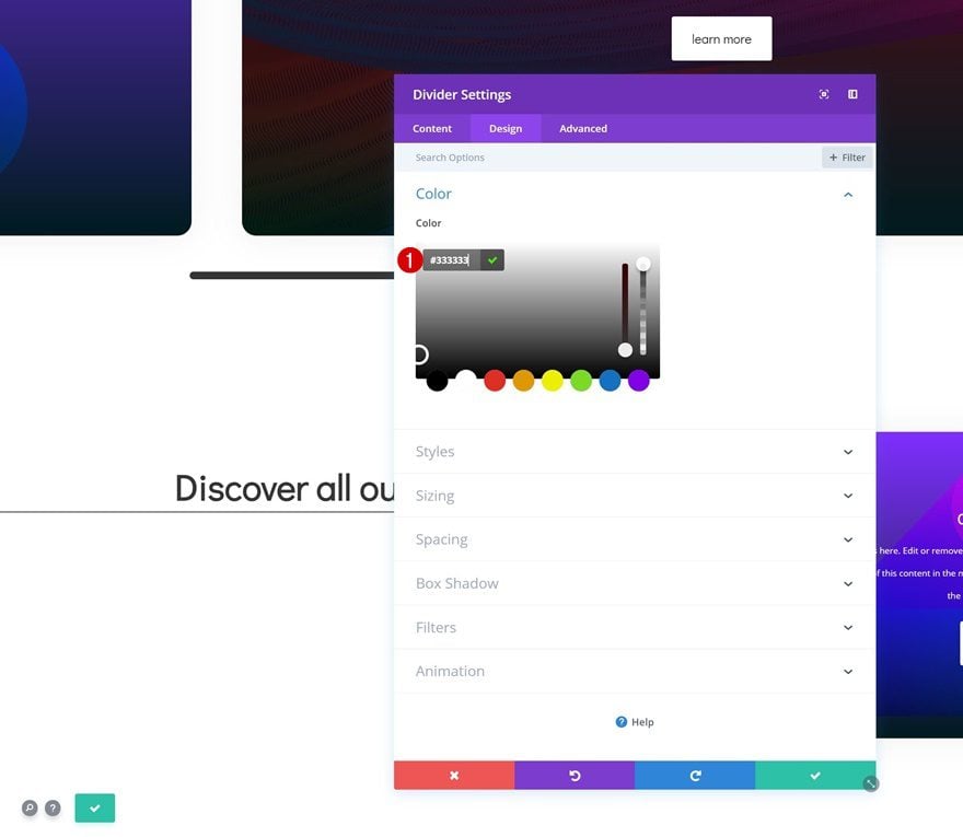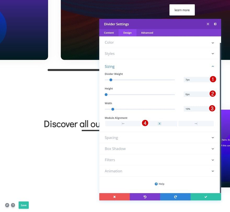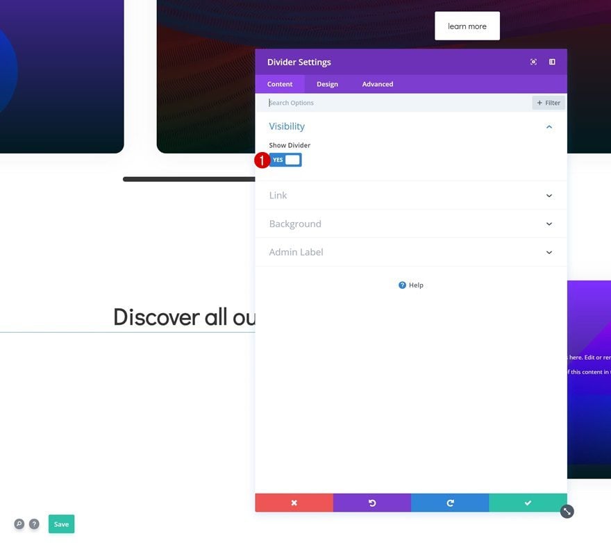 El siguiente módulo que necesitamos en la columna 1 es un módulo divisor. Asegúrese de que la opción ‘Mostrar divisor’ esté habilitada.