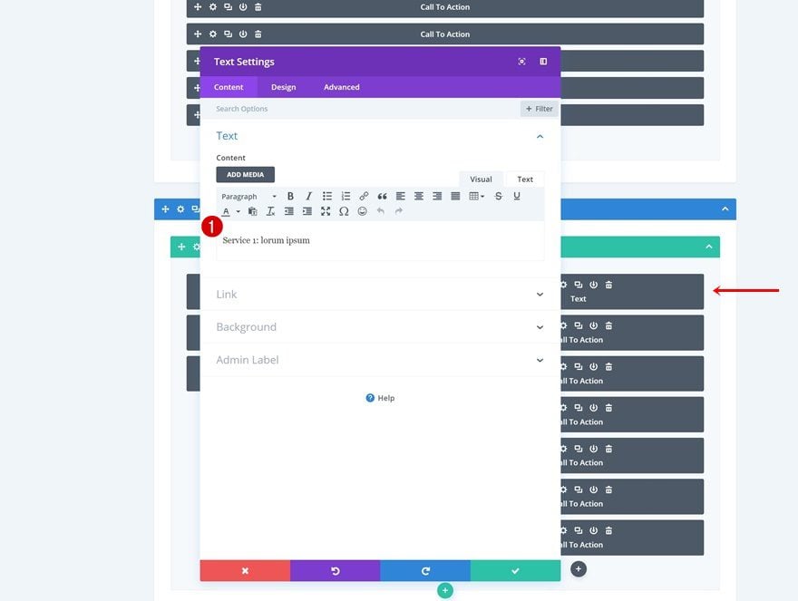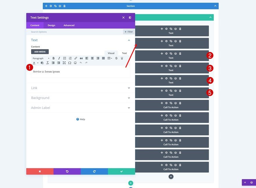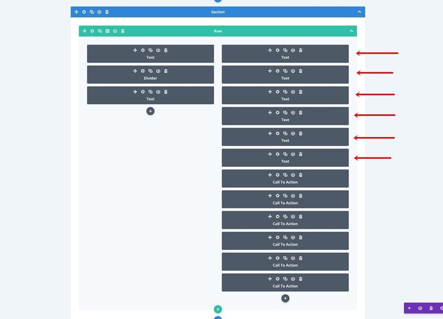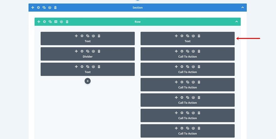 Continúe y clone este módulo de texto 5 veces. Ahora, tendrá 6 módulos de texto diferentes, esto es igual a la cantidad de módulos de CTA que también tenemos. Entonces, si usa 10 módulos de CTA en su lugar, deberá agregar 10 módulos de texto (o cualquier otro módulo) para equilibrar la estructura de la columna.