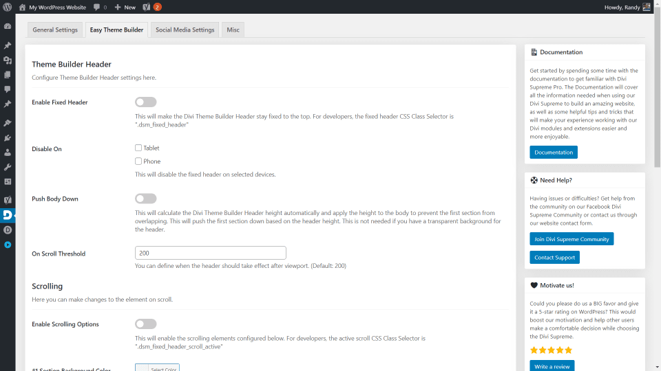La configuración miscelánea le permite eliminar los datos del complemento en la desinstalación, permitir la carga de archivos JSON, cargas SVG y cambiar el nombre y el ícono del menú Divi Supreme.