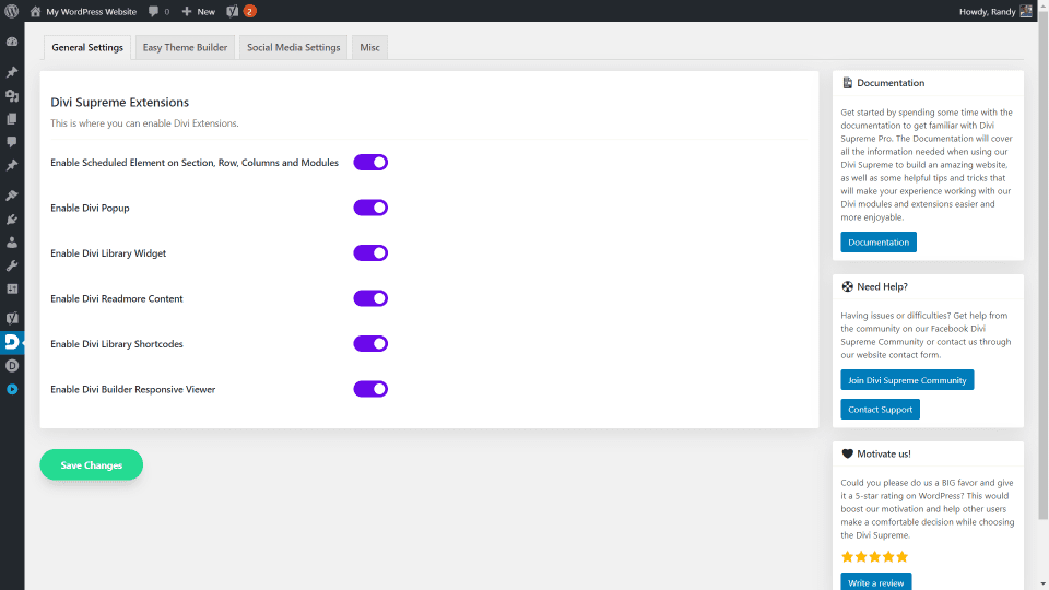Divi Supreme agrega una pantalla de menú con varias pestañas para personalizar la configuración de la forma que desee. La pestaña Configuración general incluye interruptores para habilitar elementos programados, una ventana emergente, un widget de biblioteca, un enlace para leer más contenido, códigos abreviados de biblioteca y un visor receptivo. Veamos algunos de ellos.
