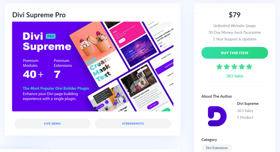 Divi Supreme está disponible en Divi Marketplace por $79. El precio incluye uso ilimitado del sitio web y un año de soporte y actualizaciones.