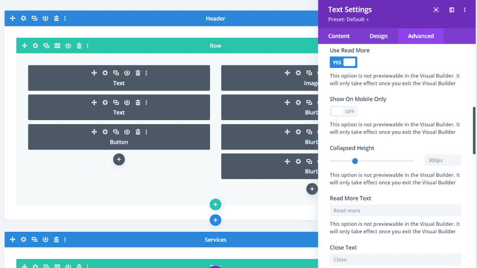 Leer más agrega un enlace a ciertos módulos para revelar su contenido al hacer clic. Elija mostrar el enlace en el móvil, la altura contraída, el texto, la fuente, los colores, la sombra, el CSS personalizado y más.