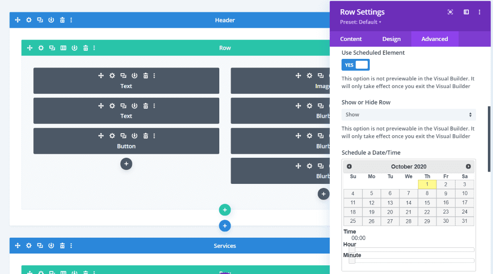 Elementos programados proporciona un calendario con la hora exacta para que pueda programar mostrarlo u ocultarlo para esos tiempos. También puede elegir a qué usuario se aplica. Esto se agrega a todas las secciones, filas, columnas y módulos.