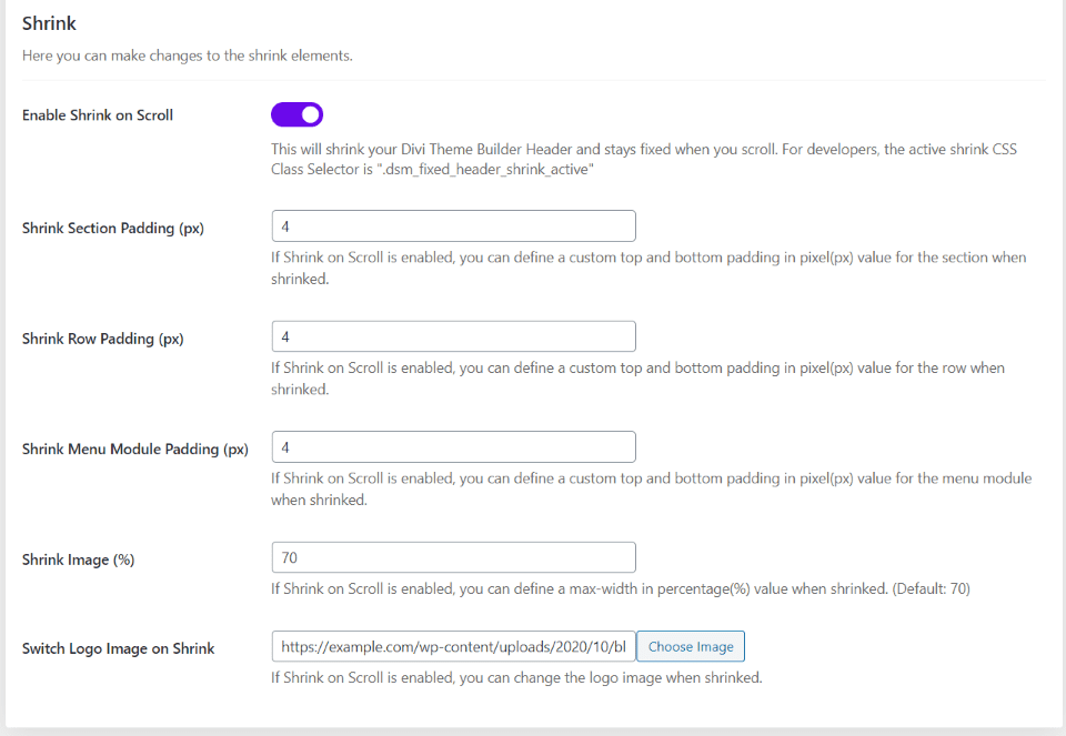 Shrink le permite especificar el tamaño del menú en el desplazamiento y cambiar el logotipo a una nueva imagen. Agregue relleno a la sección, filas, módulo y especifique un porcentaje para que la imagen se reduzca.