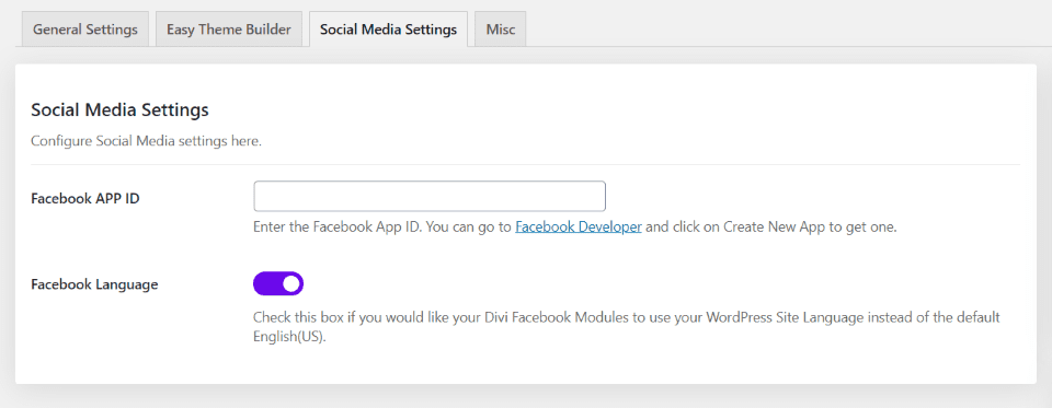 La configuración de redes sociales le permite ingresar su ID de aplicación de Facebook y cambiar el idioma para que sus módulos usen el mismo idioma que su sitio web.