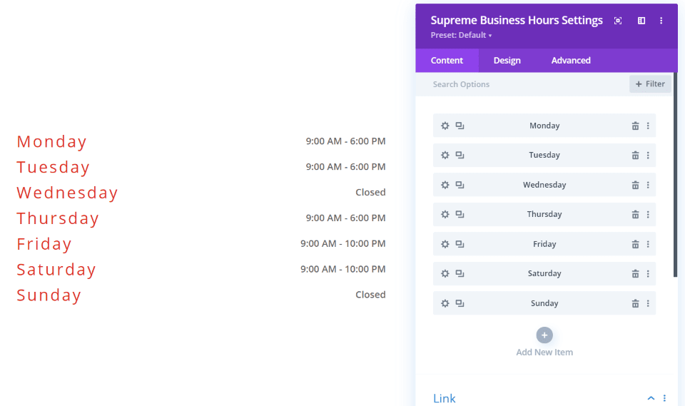 Supreme Business Hours incluye submódulos para cada día de la semana, lo que le permite nombrarlos individualmente, mostrar diferentes horas y diseñarlos. También puedes diseñarlos juntos como lo he hecho aquí. Le da control independiente sobre las fuentes de día y hora. También puede ingresar cualquier texto que desee en los campos.