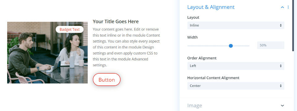 También puede hacer en línea y elegir el ancho, la alineación del orden y la alineación del contenido horizontal (que ajusta la posición vertical de la imagen). Esto muestra la izquierda para la alineación del orden y el centro para la alineación horizontal. La opción de alineación es excelente para crear CTA en un diseño alternativo.