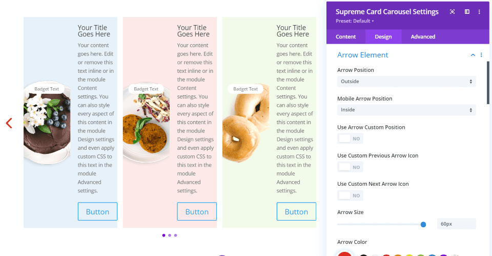 El carrusel de tarjetas Supreme proporciona las mismas características que la tarjeta Supreme, pero agrega varias tarjetas a un control deslizante. Le brinda opciones de estilo para que pueda diseñar las tarjetas de forma independiente. También agrega opciones de estilo para el carrusel, incluidas flechas y navegación de puntos, y las funciones estándar del control deslizante. Esto muestra la configuración predeterminada con las imágenes que he agregado. Esta es la alineación apilada.