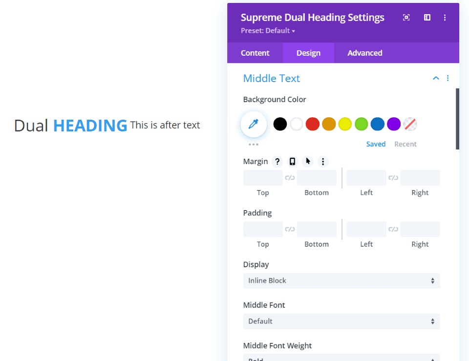 Supreme Dual Heading Proporciona tres secciones para el texto: antes, en medio y después. El texto central es de un color diferente por defecto. Los tres usan la misma configuración, pero puede diseñarlos de forma independiente. También puede mostrarlos en línea o apilados en cualquier combinación que desee. En línea es la configuración predeterminada. Aumenté el tamaño de fuente del texto anterior y medio, disminuí el texto posterior y puse en negrita el texto medio.