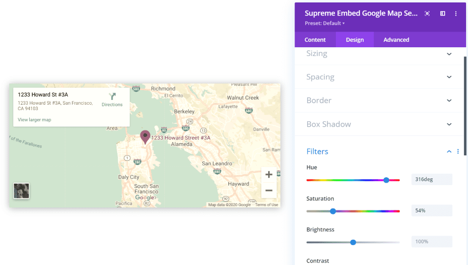 No tiene configuraciones personalizadas para ninguno de los elementos del mapa, pero tiene todas las opciones de diseño estándar. Agregué una sombra de cuadro y ajusté los filtros en este ejemplo.