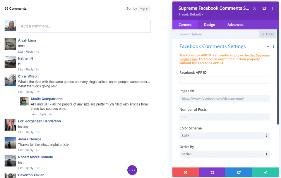Comentarios de Facebook incorpora los comentarios de una página de Facebook y permite a los usuarios comentar usando sus cuentas de Facebook. Seleccione la cantidad de comentarios que desea mostrar, elija un esquema claro u oscuro y seleccione cómo se ordenan los comentarios. Los usuarios pueden dar me gusta, responder y seguir a la persona en Facebook. Incluye configuraciones de diseño estándar.