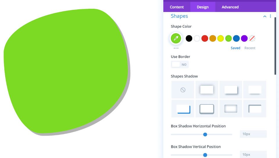 Las opciones de diseño le permiten cambiar el color, usar un borde y agregar una sombra. También incluye configuraciones de diseño estándar. Cambié el color y agregué una sombra en el ejemplo anterior.