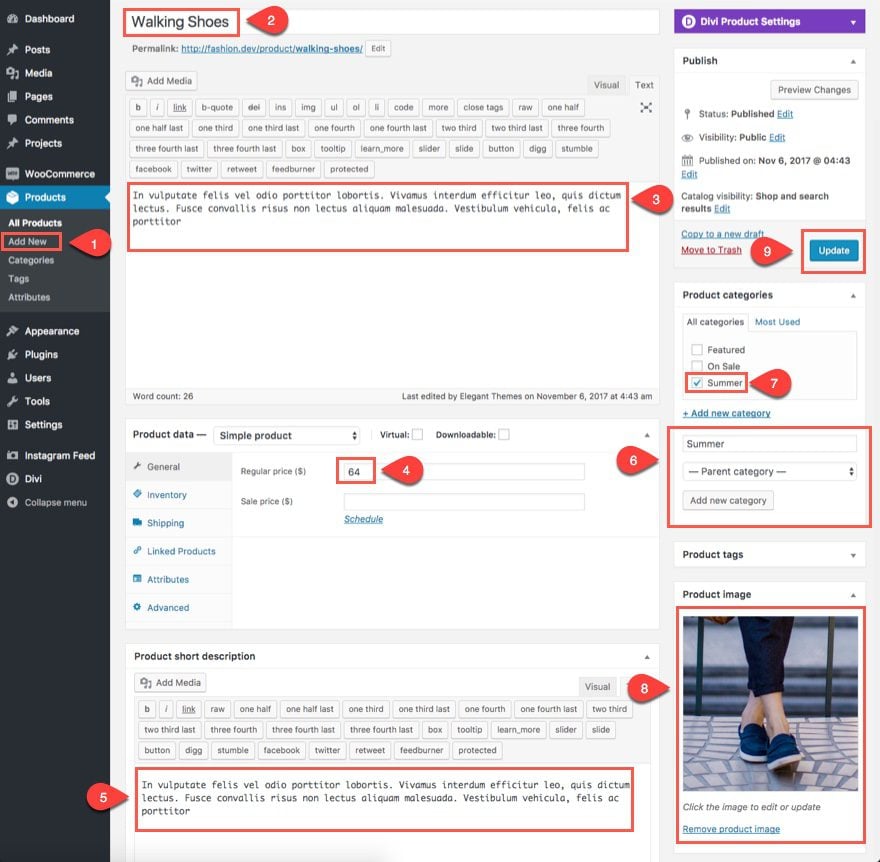 A medida que repite los pasos anteriores para crear más productos nuevos, asegúrese de asignar una categoría a cada uno (#7 en los pasos enumerados anteriormente). Para este tutorial, agregué 6 productos en la categoría «Verano», 6 productos en la categoría «Destacado» y 1 producto en la categoría «En oferta».