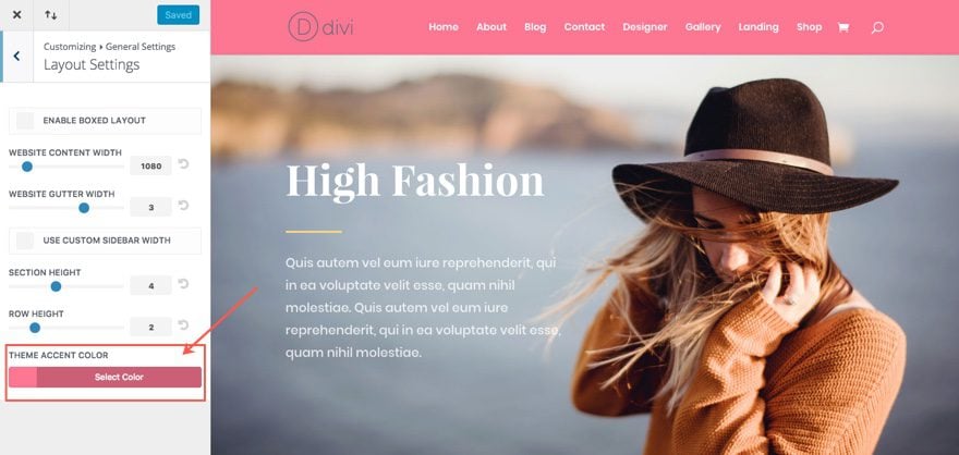 Para empezar, vamos a cambiar el color de acento global para el tema Divi. Cambiar el color de acento global para que coincida con su diseño siempre es una buena idea, pero también es la forma más fácil de combinar sus páginas de WooCommerce con su combinación de colores sin tener que usar CSS personalizado. Notará que este color de acento se usa para diseñar elementos en cada una de sus páginas de WooCommerce, como la página de un solo producto, la página del carrito, etc.
