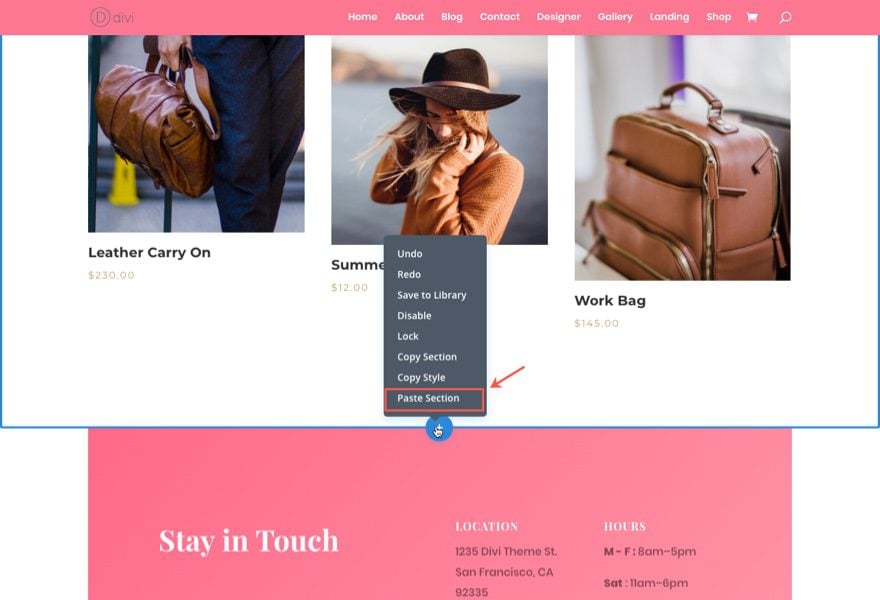 Para hacer esto, implemente el generador visual y use las opciones de clic derecho para copiar la sección completa que muestra los productos de moda de verano y péguela directamente debajo de la sección Productos destacados.