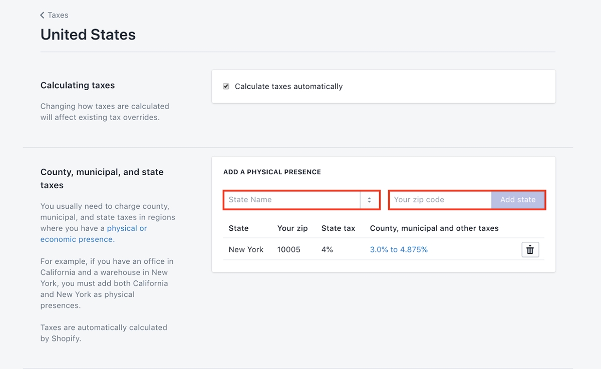 Si tienes presencia física en diferentes estados, Shopify recaudará automáticamente la cantidad correcta de impuestos sobre las ventas en un pedido según cada estado. Los pedidos que provengan de estados en los que no tenga presencia física no pagarán impuestos sobre las ventas.