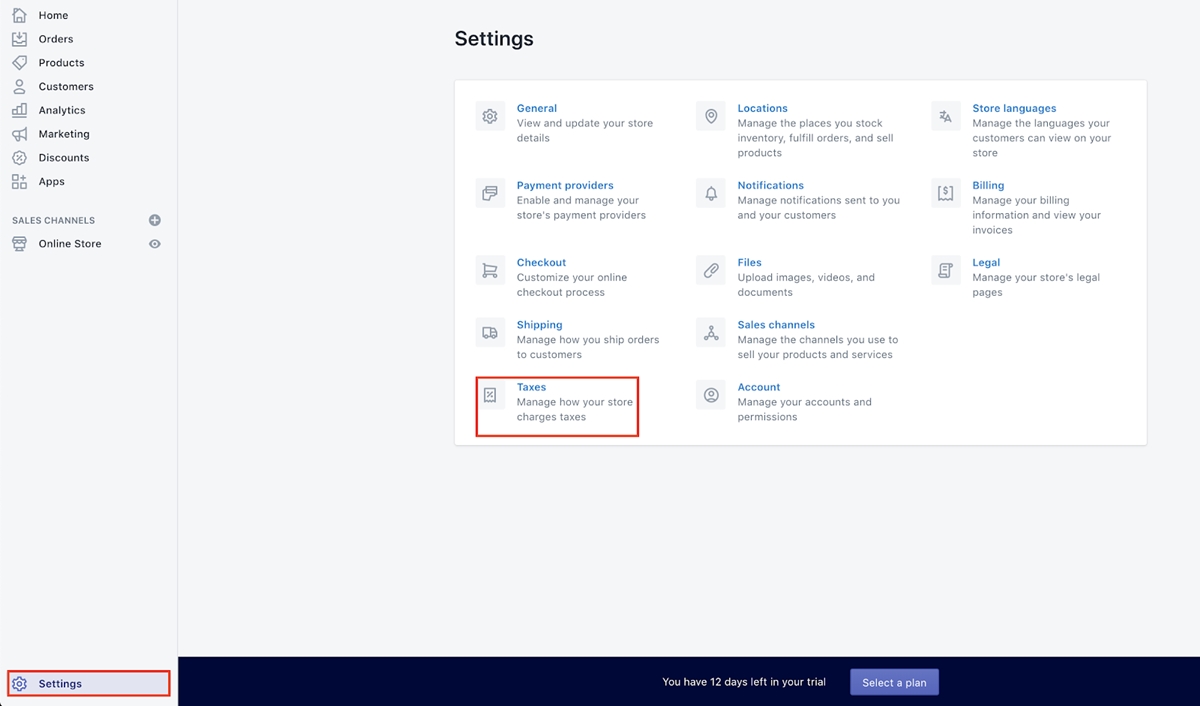 Paso 1 : en tu panel de control de Shopify, ve a Settingsy luego ve a Taxes.