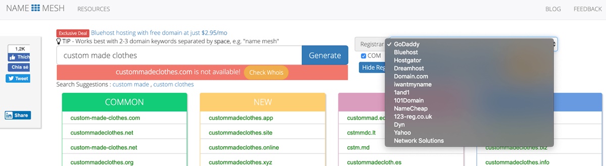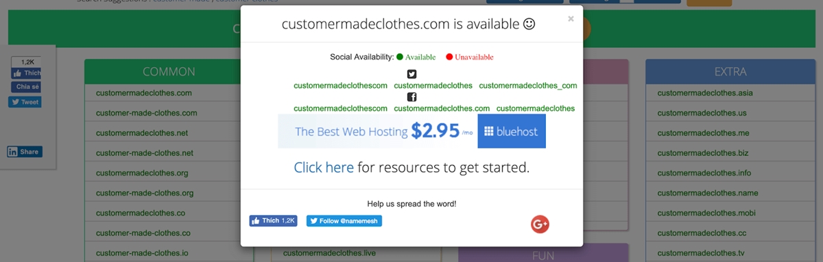 Al hacer clic en un dominio sugerido, el sistema verificará su disponibilidad en Facebook y Twitter. Esto significa que Namemesh escanea y descubre si el nombre ya existe en estos dos canales sociales. Namemesh no tiene Instagram integrado en su sistema, por lo que tendrás que comprobar esto manualmente en Instagram. De esta manera, puede usar el mismo nombre para todos sus canales de redes sociales, lo que ciertamente lo ayuda a crear una marca sólida y aumentar el reconocimiento de su marca.
