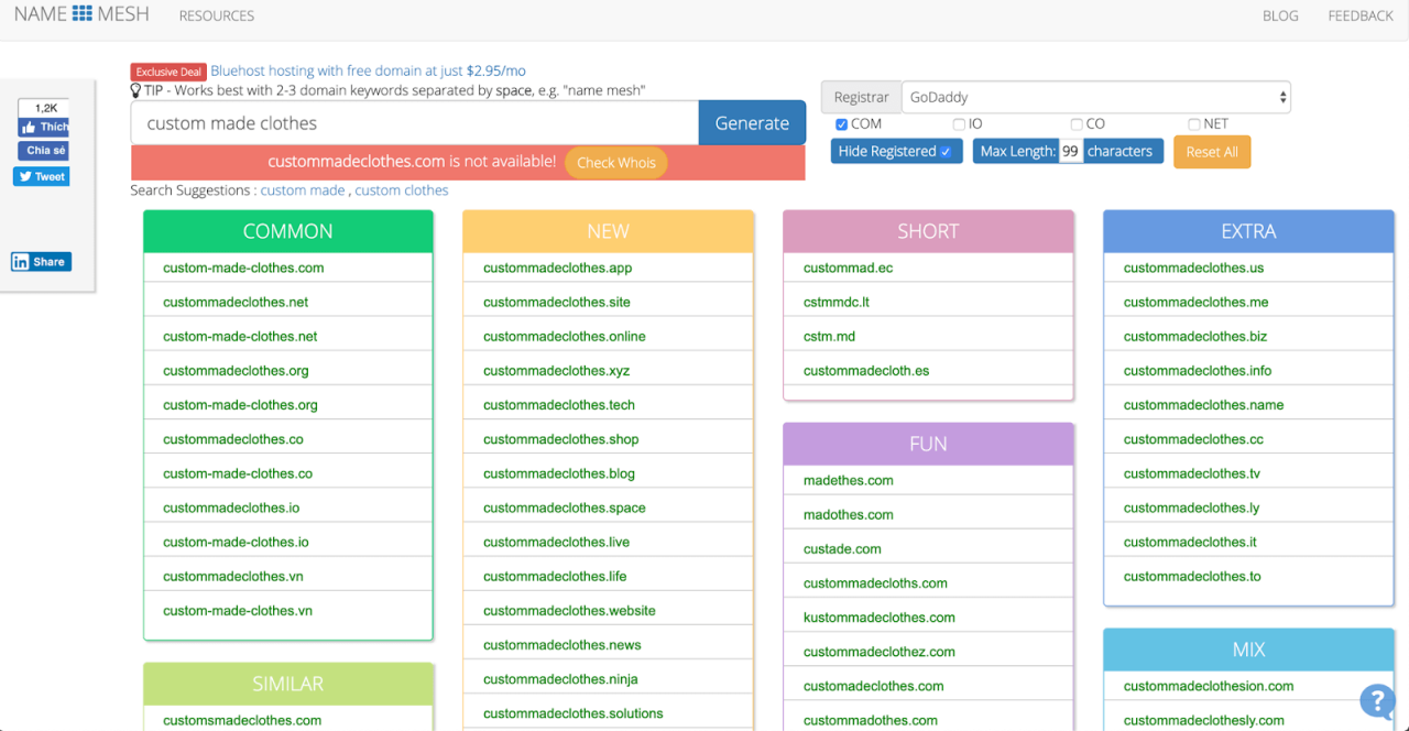 - Mezcla : este último grupo son solo algunas otras palabras generadas al mezclar prefijos y sufijos en las palabras clave que proporcionó. Entonces, solo obtiene una página completa con cientos de resultados de dominio que puede elegir según sus propósitos. Namemesh también tiene filtros que puede aplicar para eliminar opciones que ya sabe que no desea.