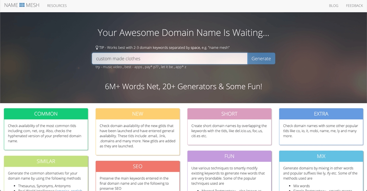 - SEO : esta sección proporciona nombres que son óptimos en términos de posibles clasificaciones de Google. Namemesh modifica ligeramente las principales palabras clave proporcionadas con prefijos o sufijos.