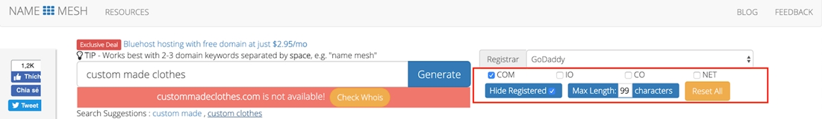 Puede mostrar solo los dominios .com, ocultar los que ya están registrados y establecer el rango de caracteres para los dominios sugeridos. “Pero entre los cientos de opciones que ofrece Namemesh, ¿cómo puedo saber cuál es la correcta?” Tu podrias decir.