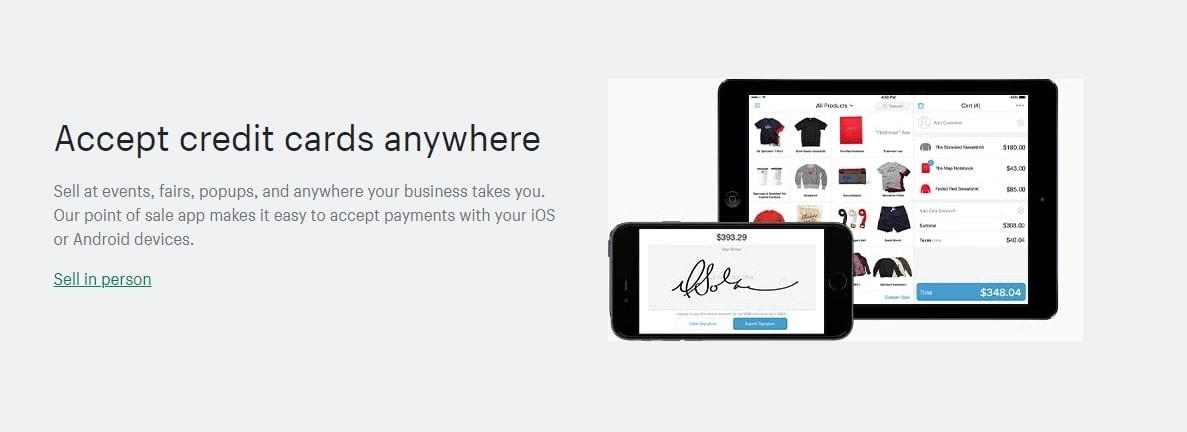 Por último, pero no menos importante, si desea vender sus productos fuera de línea (en persona), Shopify Lite puede ser una buena solución para usted. Hay muchas herramientas de procesamiento para vender en el mundo real, como PayPal, Square y Stripe. Sin embargo, Shopify Lite le abre la oportunidad de vender de ambas formas, fuera de línea y en línea.