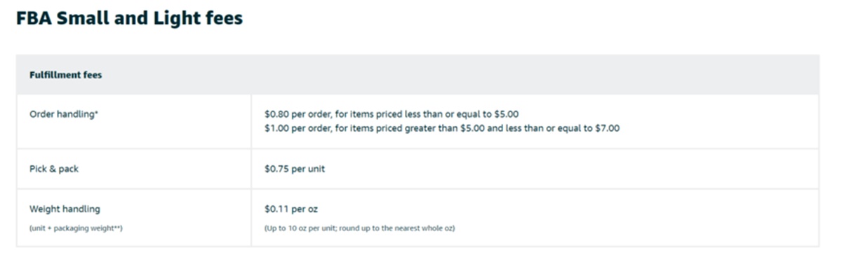 Cuando se trata del manejo del peso, que se suma al peso de la caja y los materiales de empaque de su producto, pagará $11 por onza, hasta 10 onzas por unidad. Amazon redondeará a la onza entera más cercana.