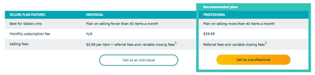 - Plan profesional: funciona mejor si vende más de 40 productos por mes. El plan le cobra $ 39.99 por tarifas de suscripción mensuales además de tarifas de referencia y tarifas de cierre variables. Sin embargo, no tiene que pagar ninguna tarifa por artículo.