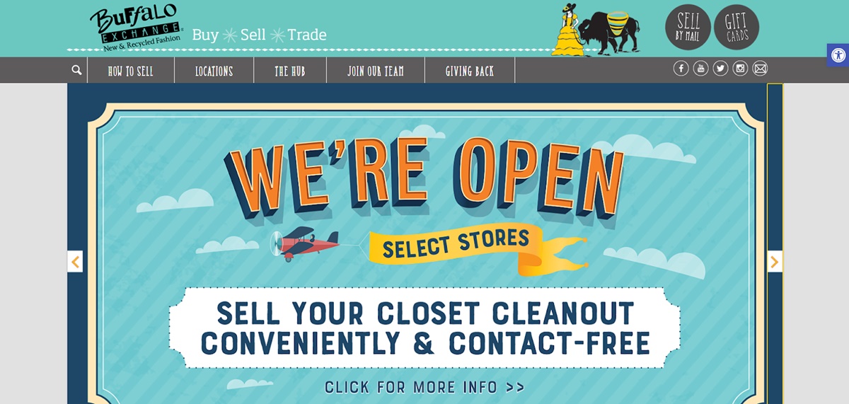 Fundado en 1974, Buffalo Exchange es un lugar de reventa de moda de propiedad privada para comprar y vender ropa usada. La compañía ahora se ha expandido a 50 tiendas en 19 estados de los EE. UU. Con la creencia de que las prendas recicladas pueden reducir la contaminación y los desechos, Buffalo Exchange acepta una amplia gama de ropa y accesorios en las mejores condiciones, como tallas grandes, ropa de hombre, jeans, camisetas, vestidos, zapatos, joyas, ropa vintage y muchos más. más.