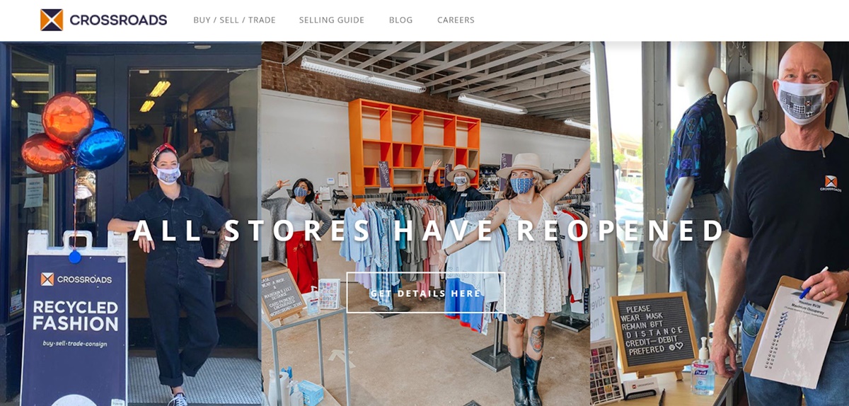 Fundada en 1991, Crossroads Trading fue una de las primeras empresas en buscar la reventa de ropa de segunda mano en lugar del comercio minorista tradicional. Tras varios años de funcionamiento, Crossroads Trading se ha extendido ahora a toda una comunidad de amantes de la moda que buscan una alternativa exclusiva para su armario. La tienda busca ropa de marca y de moda en buenas condiciones con una variedad de detalles y estilos disponibles, como pastel, lentejuelas, cuadros, bloques de colores, etc.