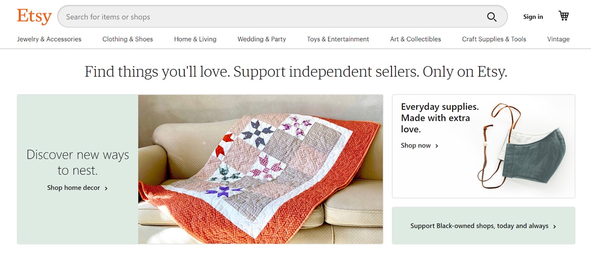 Etsy es una plataforma estadounidense de comercio electrónico centrada principalmente en artículos hechos a mano o vintage. Los artículos en Etsy varían en categorías, desde ropa, decoración del hogar, bolsos, joyas hasta materiales para manualidades.