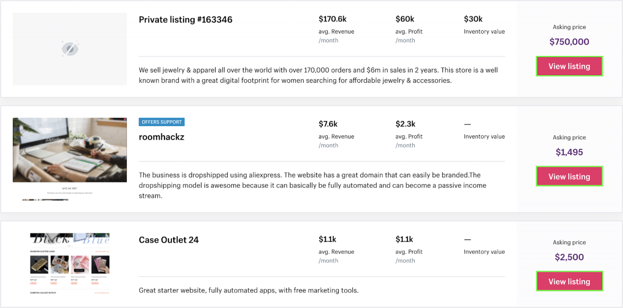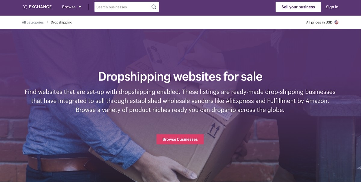 Hay muchos mercados donde se venden negocios en línea , pero hay un mercado en particular que es mejor que el resto; es Intercambio . Actualmente, ha habido más de 3000 tiendas de comercio electrónico a la venta en Exchange, y hay muchas tiendas de dropshipping entre ellas. Con Exchange, sin duda puede encontrar y comprar una tienda de dropshipping que se adapte a usted para que pueda omitir la etapa de construcción de un negocio y pasar directamente a la etapa de ejecución.