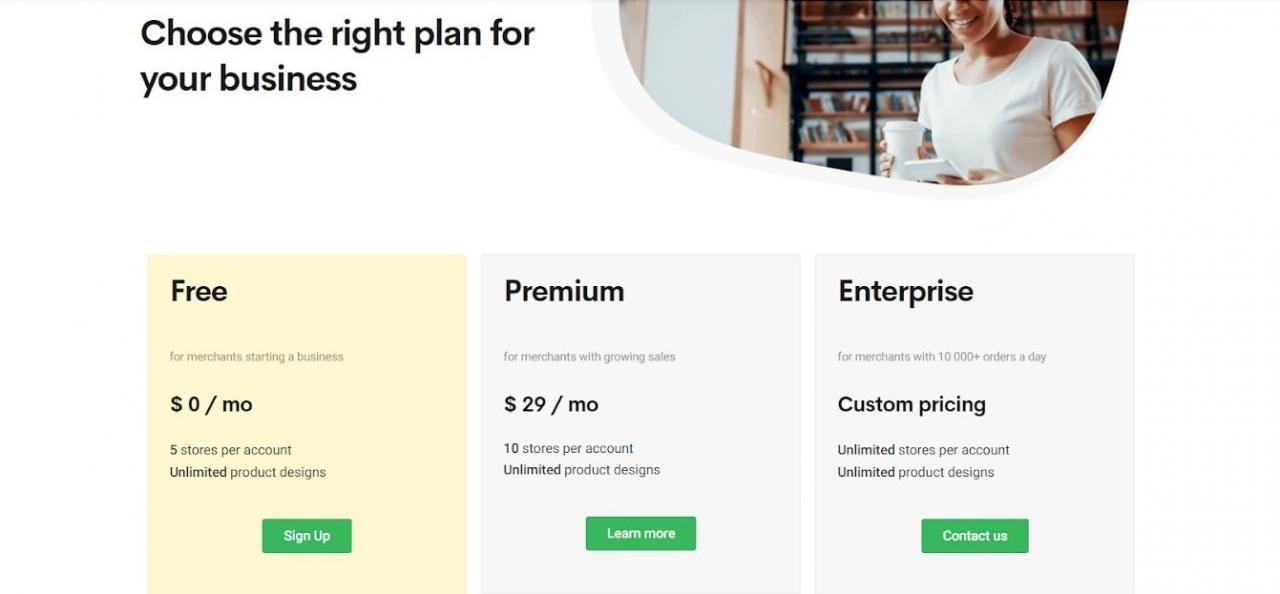 En cuanto a los precios, Printify ofrece 3 planes de precios: el plan gratuito, el plan premium por $29/mes y Enterprise con precios personalizados según las necesidades de su empresa. La versión gratuita admite 5 tiendas y le brinda diseños de productos ilimitados.