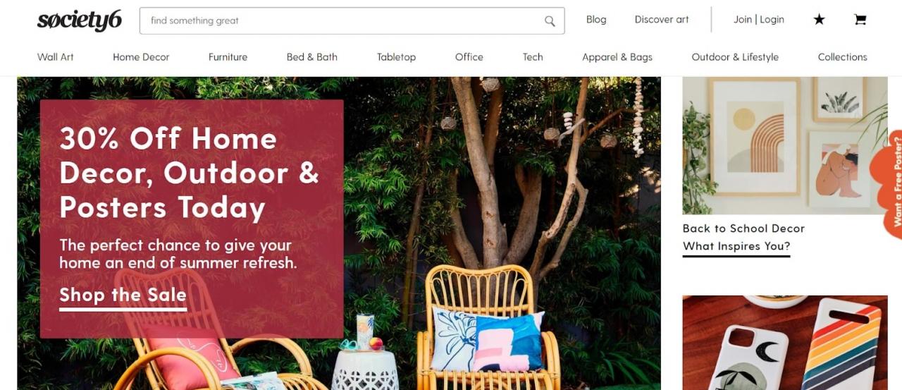 Society6 es una plataforma COMPLETAMENTE GRATUITA para que los artistas emergentes comiencen y presenten su trabajo mientras interactúan con otros en la web. Reúne a diseñadores jóvenes y establecidos para producir impresionantes obras de arte e imprimirlas en una variedad de artículos, que incluyen arte mural, decoración del hogar, ropa y productos diarios.