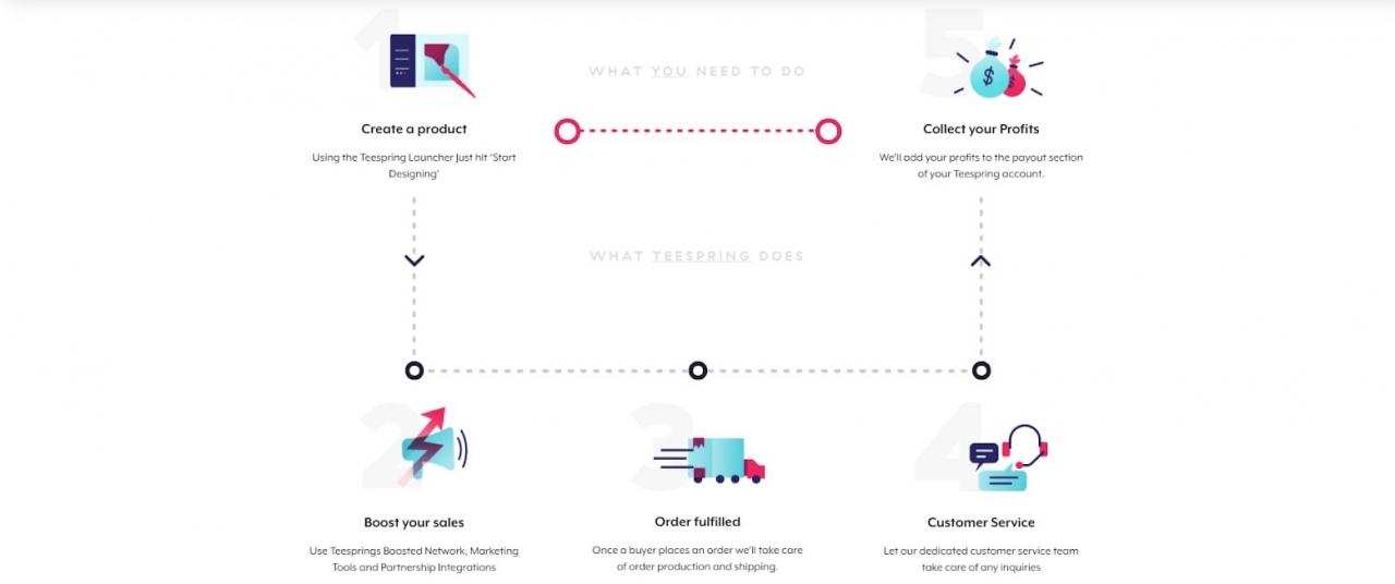 Para comenzar a ganar con esta plataforma, comience diseñando su producto preferido con Teespring Launcher. Luego use las herramientas de marketing de Teespring, como Teesprings Boosted Network, herramientas de marketing e integraciones de socios para promocionar sus productos y aumentar sus ventas. Teespring lo ayudará a encargarse del resto del proceso de impresión y cumplimiento, y con suerte solo tiene que esperar y cobrar su dinero.