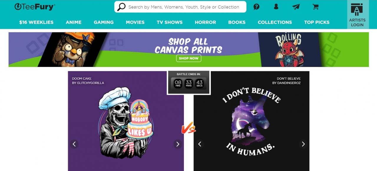 Teefury es una imprenta que se basa en el arte y se especializa en diseños de camisetas personalizadas. La empresa selecciona con frecuencia nuevas camisetas de cultura pop para ofrecer más oportunidades a las personas que eligen vender productos en línea.